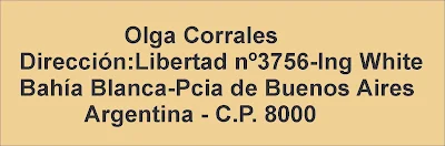 Argentina: Olga CorralesCorreo:corralesolga@hotmail.comDirección:Libertad nº3756-Ing WhiteBahia Blanca-Pcia de Bs As-ArgentinaC.P. 8000