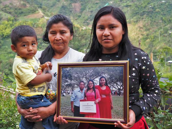 La madre, la hermana y el sobrino de Cristina Bautista en su resguardo indígena, Tacueyó, en el departamento del Cauca, Colombia BERTA CAMPRUBÍ